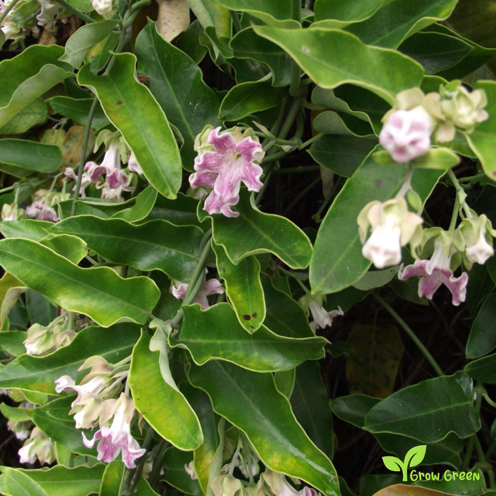 The twining stems bear plenty of fragrant, chalice-shaped bisexual flowers, about 2 centimetres (0.79 in) in diameter, with five white, creamish, violet or pale pink petals. The flowers are usually pollinated by moths (hence the common name "moth plant"), butterflies and bees (entomophily), but they are capable of automatic self-pollination. The structure of the flower includes a number of wedge-shaped openings that occasionally and inadvertently trap the pollinator's proboscis, leading to its death. The flowering period extends from July through September in the northern hemisphere and from November through February in the southern hemisphere.