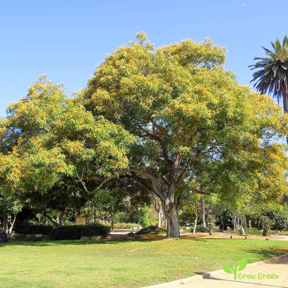 Growing up to 30 metres (98 ft) in height and 20 metres (66 ft) wide, Tipuana tipu is well known for its use as a shade tree. The leaves of the tree are pinnately compound, 10 inches (25 cm) long; the pinnules typically are 1 to 3 inches (2 to 7 cm) long, and are variably paripinnate or imparipinnate on the same tree. The flowers are bright yellow in color and bloom only briefly in the late summer. The fruit is a hard, pod with the seed at one end.