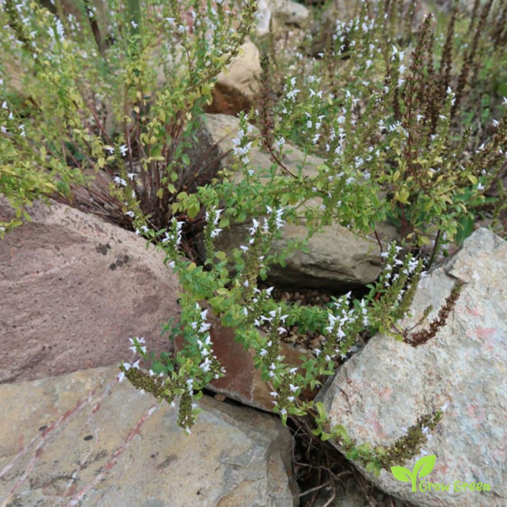 Balkan Mint (syn. Clinopodium Thymifolium) is a perennial winter hardy species with pleasant mint-fragrant, oval, dark green, slightly glossy leaves and upright racemes with numerous small white flowers. The leaves may be used for the preparation of herbal teas. Micromeria thymifolia is native of open sites in Hungary and the Balkan region. For any rich, well drained soil in a sunny spot.